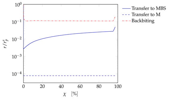 Na-MBS is a known chain-transfer agent [], thus the kinetic scheme also considers the transfer reactions to monomer and MBS. This is a particular reaction arising from the use of MBS and is generally not present in classical kinetic schemes. Transfer to the monomer can also occur [], while the transfer reaction to dead chains (polymers) was observed to be negligible under the investigated conditions and it is generally not accounted for []. Transfer to water was considered negligible, compared to other transfer mechanisms [].