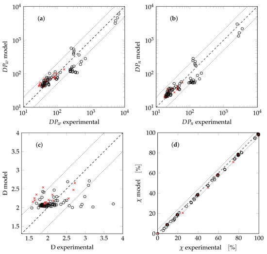 Parity plots for the SBR tests: (a) weight-average chain length; (b) number-average chain length; (c) polydispersity; (d) overall conversion. Crosses indicate data used for the fitting procedure.