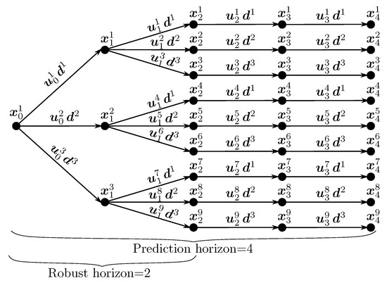 Multi-stage NMPC [21] is a robust NMPC strategy that models the effect of the uncertainties by a tree of discrete scenarios as shown in Figure 2. Each branch of the scenario tree represents the trajectory of the system states for a given control input and a particular realization of the uncertainty that can vary at each point in the prediction horizon. Multi-stage NNPC computes control inputs while taking into account that measurement information will be available in the future and that the future control moves can be adapted accordingly, i.e., the control inputs beyond the next time step become scenario-dependent recourse variables. This allows us to solve a feedback problem as an open-loop optimization problem. The closed-loop formulation results in a significant improvement in the performance of the robust controller in comparison to open-loop schemes [7,48].