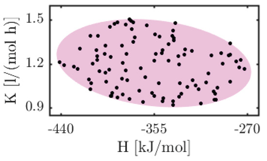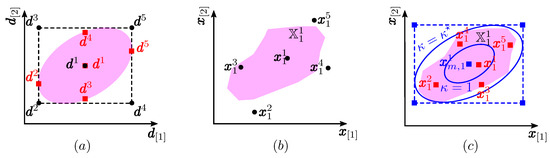 The unscented transformation is used to compute the statistics of variables which undergo a nonlinear transformation [26,46,47]. The principle behind the unscented transformation is illustrated in Figure 1, where and the uncertain parameters undergo a nonlinear transformation by an arbitrary function . The pink shaded region in Figure 1a represents the confidence region of the uncertain parameters and in Figure 1b it represents the image set of the nonlinear function (i.e., ). points known as the sigma points (marked with red squares in Figure 1a) are chosen such that they capture the true mean and the covariance of the uncertain parameter set and are given as Equations (3) and (4):