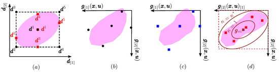 MS-CB NMPC computes a box over-approximation of the reachable set of the constraint function using the predictions obtained from the scenario tree of the multi-stage NMPC. The difference between MS-VA NMPC (Section 3.1.2), MS-SB NMPC (Section 3.2.1) and MS-CB NMPC (Section 3.2.2) is shown in Figure 4 for a system with two states, two uncertain parameters, a given control input and two constraints at time in the prediction horizon. Figure 4a is same as the Figure 3a. Figure 4b–d represent the reachable sets in the constraint space. The pink shaded region represents the image of the constraint functions for the reachable states of the model (1). The control inputs , , , and are equal due to the non-anticipativity constraint.