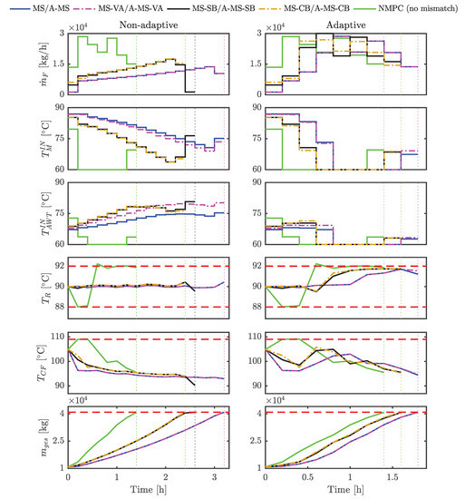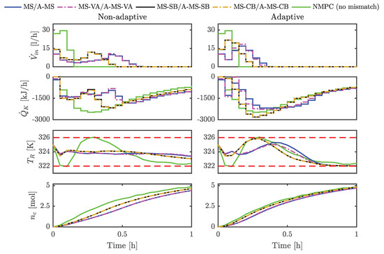 The formulations of A-MS-SB NMPC and A-MS-CB NMPC are similar to MS-SB NMPC and MS-CB NMPC Equations (10) and (14) where Equation (10b) are replaced by the following Equation (22):