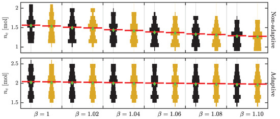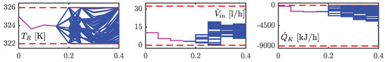 where represents the reachable states set of model (1). The condition Equation (13) is satisfied if the predicted box over-approximation of the state ellipsoid encloses the set of reachable states and the sensitivity of the constraints with respect to the states does not change its sign. Otherwise, should be tuned based on posterior analysis using simulation studies such that the condition Equation (13) is satisfied. In this work, the recursive feasibility of multi-stage NMPC using sigma points is verified using simulation studies. The scaling factor is proportional to the value of the parameter β. The parameter β is chosen based on posterior analysis using simulation studies in a way that the predicted state ellipsoids enclose the reachable states sets along the robust horizon. Theoretical guarantees on the stability and recursive feasibility of the multi-stage NMPC using sigma points are not considered in this work but can be achieved by choosing a full robust horizon (i.e., ) and tuning β systematically [17,59]. This will be part of our future work.