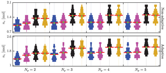 Black dots in Figure 4b represent the value of the constraint function for the state predictions obtained on the branches of the scenario tree of MS-VA NMPC. It is assumed that . The optimal control input computed using MS-VA NMPC satisfies the constraints only for the parameter combinations considered in its scenario tree. The box over-approximation of the parametric confidence region introduces additional uncertainty in the parameter values which may result in a large back-off from the bounds (shown for in Figure 4b) and may result in a loss of performance.