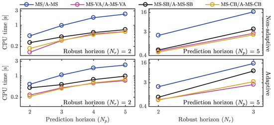 The key difference between the adaptive version of multi-stage NMPC (A-MS NMPC and A-MS-VA NMPC) and multi-stage NMPC using sigma points (MS-SB NMPC and MS-CB NMPC) lies in the approximation of the intersection region between two ellipsoids to generate the scenario tree. Standard adaptive multi-stage NMPC approaches over-approximate the intersection region by a minimum perimeter box which can be obtained by solving the optimization problem Equation (19). The adaptive version of multi-stage NMPC using sigma points over-approximates the intersection region by an ellipsoid, which is computed as a part of the NMPC optimization problem. In the NMPC optimization problem an over-approximating ellipsoid from a set of candidate ellipsoids is computed that is optimal for adaptive multi-stage NMPC using the sigma points approaches. This comes at the expense of an additional computational cost.