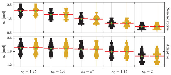 and represent the lower and upper bounds on the uncertain parameters which bound the intersection of the ellipsoidal confidence regions and . Whenever a measurement from the plant becomes available, the new parameter estimates are obtained by solving the least-squares estimation problem Equation (15), and the corresponding parameter covariance matrix is computed using Equation (18). The optimization problem Equation (19) is then solved to compute the new bounds on the uncertain parameters. The scenario trees of the A-MS/A-MS-VA NMPC optimization problem are updated according to Equation (20) or Equation (21) and the adapted optimization problem is solved to compute the optimal control input which is applied to the plant.