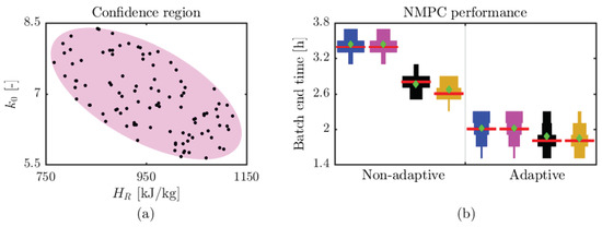 The key difference between MS-VA NMPC (Section 3.1.2) and MS-SB NMPC is illustrated in Figure 3 for a system with two states, two uncertain parameters, and a given control input at time . Figure 3a represents the parametric space. The pink shaded region represents the ellipsoidal confidence region of the uncertain parameters given by Equation (2). Black dots (vertices of the box over-approximation of the uncertainty set) and red squares (sigma points obtained using Equation (3)) represent the parameter samples that are chosen to build the scenario tree of MS-VA NMPC and MS-SB NMPC, respectively. The nominal value of the uncertain parameter is considered in the scenario tree of both MS-VA NMPC and MS-SB NMPC.