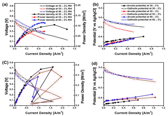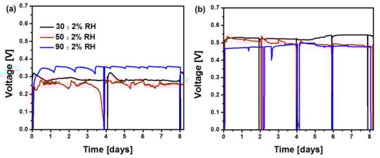 The voltage was measured during MFC operations with Nafion 117 and PP80 as the separators under three different relative humidity (RH) conditions. The RH values of 30 ± 2%, 50 ± 2% and 90 ± 2% were maintained by using a humidifier during the operation. MFC operation with Nafion 117 at an RH of 90 ± 2% exhibited a maximum stable voltage generation of 0.35V with an external resistance of 600 Ω (Figure 2). This maximum voltage generation was 1.34 and 1.25-fold higher than the operations with 50 ± 2% RH (0.26 V) and 30 ± 2% RH (0.28 V), respectively. The cathode and anode potential at 90 ± 2% RH were noted to be −0.180 V and −0.523 V vs. Ag/AgCl, respectively. MFC operations with 30 ± 2% and 50± 2% RH exhibited a lower cathode potential of −0.189 V and −0.261 V, respectively, thereby suggesting that a higher RH condition in the cathode is beneficial for efficient cathodic oxygen reduction reaction (ORR) reactions with a Nafion 117 separator. Additionally, the higher power density at 90 ± 2%, is possibly due to higher proton or hydroxyl ion transports on the cathode [9]. The anode potentials were increased with the decrease in RH levels in the cathode part, and the increased values were −0.512 V and −0.473 V for 50 ± 2% RH and 30 ± 2% RH %, respectively. This result suggest that higher RH conditions have a negative effect on both anode and cathode performance.