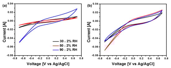 Cyclic voltammogram analysis of air-cathode MFCs with Nafion 117 (a) and PP80 (b) at different relative humidity (RH).