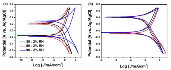 On the other hand, the MFC operation with PP80 as a separator exhibited a maximum stable voltage generation of 0.53 V at a relatively lower RH of 30 ± 2%. This voltage generation was noted to be 1.51 times higher than the MFC operation with Nafion 117 at 90 ± 2% RH. In addition, the maximum voltage generation at 30 ± 2% RH was 1.06 and 1.10 times higher than the voltage generation noted at 50 ± 2% RH (0.50 V) and 90 ± 2% RH (0.48 V), respectively. The cathode and anode potentials at 30 ± 2% RH were 0.043 V and −0.487 V, respectively. The cathode potential at higher RHs was found to be similar to the value with 30%, and the values were 0.047 V and 0.049 V at 50 ± 2% and 90 ± 2% RH, respectively. This result indicates that the variation in RH in the cathode with a PP80 separator does not affect much the ORR reactions with 1000 Ω external resistance. Moreover, the cathode potential with PP80 was much higher than the values with Nafion 117, which might be due to a larger pore size of PP80 (30 µm vs. 50 × 10–4 µm for Nafion 117) resulting in more oxygen and proton transports for an efficient ORR environment on the cathode electrode [7,17]. However, the increase in anode potential with the increase in RH levels was observed, and the values were −0.437 V and −0.430 V at 50 ± 2% and 90 ± 2% RH, respectively. This was in a good agreement with earlier studies of MFCs with a Nafion 117 separator, in which the power generation was decreased with an increase in humidity from 0% to 100% [10].
