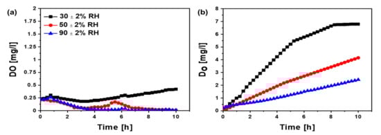 Relative humidity at the cathode can possibly alter the oxygen mass transports to the anode chamber, which is one of the important factors affecting the overall performance of MFCs. High oxygen diffusion to the anode from the cathode that faced the atmospheric air could reduce bioexoelectrogenic activities at the anode and also enhance biofilm development on the membrane or the electrodes [22]. In this study, the maximum oxygen transfer coefficient (Ko) and diffusion coefficient (Do) values were calculated at the low RH condition (30 ± 2%) in both Nafion and PP80 (Figure 6). The high Ko and Do in the air-cathode MFC with Nafion 117 at 30 ± 2% RH were noted to be 0.35 × 10−4 cm/s and 0.70 × 10−6 cm2/s, respectively (Table 2). With the higher RHs of 50 ± 2% and 90 ± 2%, the DO levels were not increased with the prolonged operation, and so the oxygen diffusion was not observed. Likewise, the maximum Ko and Do values with PP80 were observed at 30 ± 2% RH, and the values were 13.60 × 10−4 cm/s and 5.7 × 10−5 cm2/s, respectively. With an increase in RH to 50 ± 2%, the Ko and Do decreased to 7.81 × 10−4 cm/s and 3.30 × 10−5 cm2/s, respectively. With a further increase of RH to 90 ± 2%, these coefficients were decreased to 4.15 × 10−4 cm/s (Ko) and 1.70 × 10−5 cm2/s (Do). The Ko of PP80 at an RH of 30 ± 2% is 38 times higher than the Nafion 117, possibly due to the larger pore size of PP80 which could increase the oxygen permeation. The high oxygen diffusion to the anode chamber with PP80 might cause higher anode potentials than the values with Nafion 117 [23,24]. In addition, at higher RHs, water evaporation to the cathode side could be minimized leading to the blockage of pores and forming a dense biofilm at the cathode and thereby minimizing the oxygen cross over from cathode to anode [25].