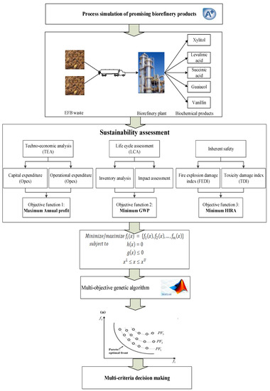 In this work, annual profit is estimated by Techno-Economic Analysis (TEA), Global Warming Potential (GWP) is quantified using Life Cycle Assessment (LCA), and Fire and Explosion Damage Index (FEDI) and Toxicity Damage Index (TDI), categorized as hazard potential, are performed using Hazard Identification and Ranking Assessment (HIRA) from Khan et al. [46]. The goal is to find an optimal EFB-based biorefinery configuration, simultaneously considering economic, environmental, and safety aspects. The design problem is presented as a multi-objective optimization (MOO) problem, which is solved by a multi-objective genetic algorithm to determine optimal capacities, yield and biomass allocation lead to maximum profit, the minimum of both global warming potential and hazard level. The obtained results (the so-called Pareto-optimal solutions) reveal the trade-off among the objectives. In the subsequent step, a combined approach of Fuzzy Analytical Hierarchy Process (FAHP) and Technique for Order Preference by Similarity to Ideal Solution (TOPSIS) is applied to select one of the Pareto-optimal solutions.