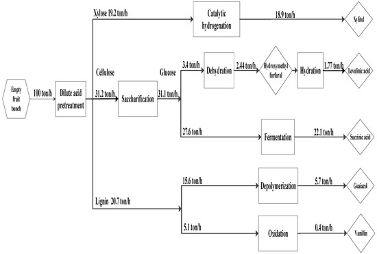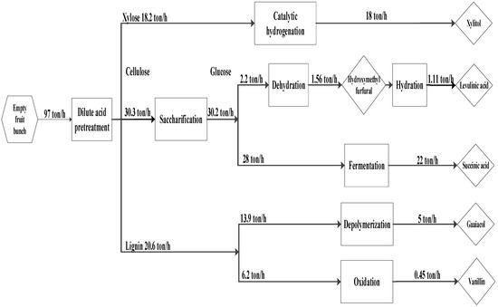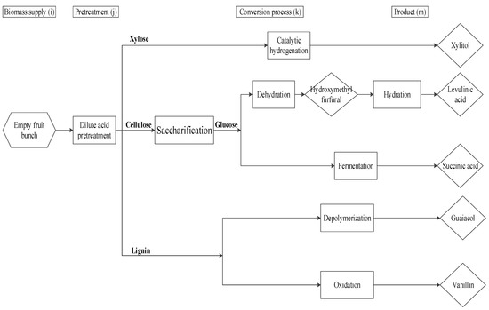 The proposed superstructure for biorefinery based on EFB is shown in Figure 3. The underutilized EFB supply is collected and transported to a central processing facility. Transportation costs and supply chain issues are not considered in this work. The EFB then undergoes a pre-treatment process to break down its major components into cellulose, hemicellulose, and lignin, which will be used as the feedstock to subsequent processes to produce xylitol, levulinic acid, succinic acid, guaiacol, and vanillin.