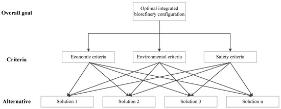 This work is to find the best optimal biorefinery superstructure configuration incorporating the sustainability criteria, which are comprised of economic, environment and safety aspects. The Pareto-optimal solutions generated by solving the MOO problem are the alternatives. The detailed decision model is presented in Figure 4.