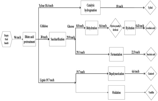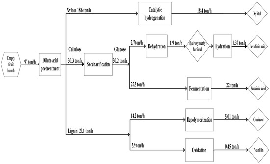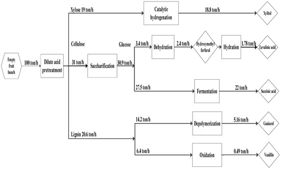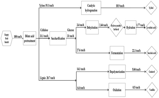 The proposed integrated biorefinery model is depicted in Figure 1, where EFB generated from palm oil mill activity is collected and sent to a centralized integrated biorefinery area. The potential of converting other palm oil wastes to valuable products is not considered in this work. A flowchart of the methodology of the present study is outlined in Figure 2. EFB composition is taken from Chiesa et al. [47]. Dilute acid pretreatment, enzyme production, and saccharification processes are selected and simulated in Aspen Plus V10 according to Humbird et al. [48]. The number of conversion steps for this work is limited to five biochemical products according to the potential revenues, and they are xylitol [49,50], levulinic acid [51], succinic acid [52], guaiacol [53], and vanillin [54]. The process simulation results are then used for equipment sizing and sustainability assessment.