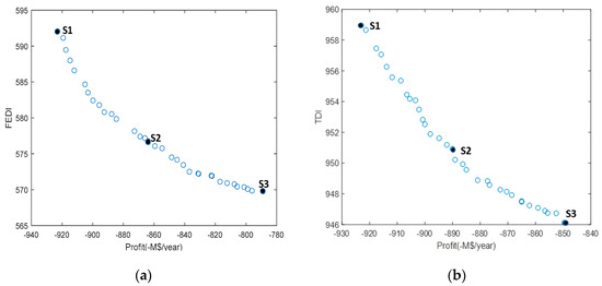 This scenario considers the maximization of profit and minimization of FEDI and TDI. Figure 8a,b represents the Pareto-optimal curve for annual profit versus FEDI and annual profit versus TDI from the MOO results. Three solutions on each curve are identified for comparison. Table 9 and Table 10 give the corresponding sets of optimal decision variables and objectives, respectively. For profit and FEDI scenario, point S1 represents the solution with the highest of both annual profit and FEDI score of 923 M USD/year and 592, respectively. In this solution, the maximum of 100 ton/h of EFB is necessary with the same allocation of cellulose as in Case 1 (all three solutions in Figure 5). Interestingly, lignin allocation is now different, where 80% is sent to guaiacol and the remaining goes to vanillin. This is because guaiacol production has lower FEDI score than vanillin. The use of ethyl acetate in extraction step increases FEDI score of vanillin process. Figure 9 shows biorefinery configuration for solution S1 in Figure 8a. This biorefinery fulfills global demand of xylitol by 57%, levulinic acid by 95%, succinic acid by 25%, guaiacol by 100% and vanillin by only 9%.
