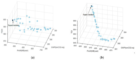 Figure 13a shows the Pareto-optimal solutions for annual profit, GWP, and GEDI, whereas Figure 13b shows them for annual profit, GWP, and TDI. The optimal values for the chosen solution (shown by filled circle in both these plots) by FAHP and TOPSIS are summarized in Table 13 and Table 14. Since the main factor is economy, the preferred solution out of many Pareto-optimal solutions is the one with the highest profit. The corresponding optimal biorefinery configuration is depicted in Figure 14.