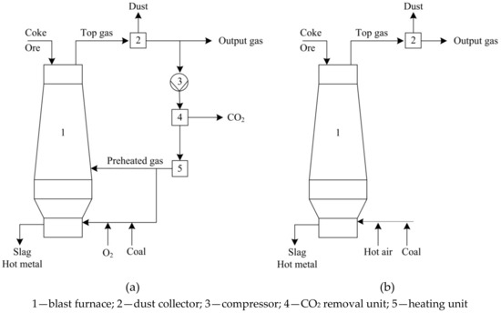 Schematic diagrams of (a) oxygen blast furnace with top gas recycling (TGR-OBF) and (b) traditional blast furnace (TBF).