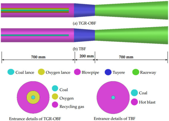 The geometric details of the models are shown in Figure 2. The models simulated the lance–blowpipe–tuyere–raceway of blast furnaces. The coal particles mainly flowed along the horizontal direction in the raceway region. The coal burnout at the end of the raceway represented that of the entire raceway region. Therefore, the investigations were mainly focused on coal combustion along the horizontal direction. The 120 m3 TBF was dissected in 2007. The dissection results showed the raceway depth to be about 700 mm. Therefore, the raceway was designed as a tube of 700 mm length with a divergence angle of 3° in accordance with others [27].