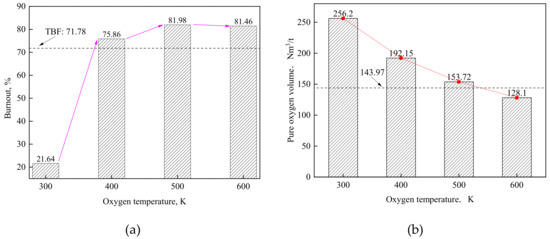 Figure 3a shows the effect of oxygen temperature on the final coal burnout at the raceway outlet. In general, the effect of oxygen temperature was very obvious. The coal burnout at 300 K was only 21.64%. When the oxygen temperature increased to 400 K, the coal burnout increased to 75.86%. The burnout at 500 K was 81.98%, which was the maximum. As oxygen temperature continued to increase, the coal burnout slightly decreased. The coal particles were in direct contact with the oxygen stream after leaving the coal lance. The cooling effect of room-temperature oxygen delayed the coal combustion process. The cold oxygen volume decreased with the increase in oxygen temperature. The adverse effect of cold oxygen was weakened, and the char had more time to react with oxygen. Figure 3b shows the changes in pure oxygen volume with oxygen temperature. The complete combustion of 150 kg/t∙HM pulverized coal required 143.97 Nm3 O2. However, the pure oxygen volume at 300 K was 256.2 Nm3/t∙HM, which could fully meet coal combustion. The excess cold oxygen would be harmful for coal combustion. The pure oxygen volume at 400 and 600 K could both meet full combustion of 150 kg/t∙HM pulverized coal. The pure oxygen volume at 600 K was 128.1 Nm3/t∙HM. This would not theoretically meet full combustion of 150 kg/t∙HM pulverized coal. Furthermore, some oxygen would be used for recycling gas combustion. Therefore, the coal burnout slightly decreased. It can be concluded that properly decreasing the oxygen volume in direct contact with coal particles is very useful for coal combustion.
