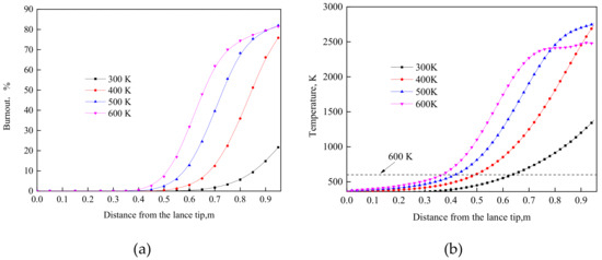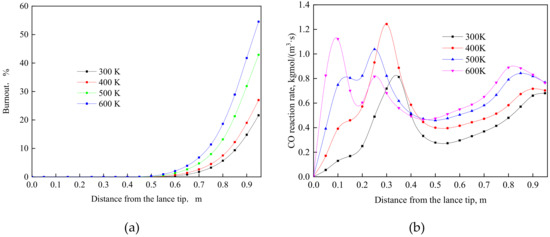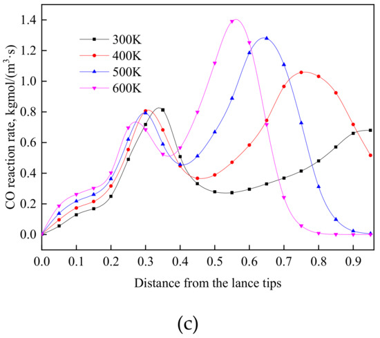 The coal burnout at different positions was investigated, as shown in Figure 4a. The coal combustion process was enhanced with increase in oxygen temperature. When the oxygen temperature was 300 K, the coal particles only began to release volatiles at a distance of about 0.6 m. With the increase in oxygen temperature, the coal combustion process was enhanced. In particular, the coal particles already started to release volatiles at a distance of 0.4 m at 600 K oxygen temperature. If the devolatilization process was to be extended, the char combustion process would be shortened. Finally, the coal particles would leave the raceway region without full combustion. Significant devolatilization starts at about 600 K [28,33]. Figure 4b shows that the coal particles were rapidly heated with the increase in oxygen temperature. This was the main reason for the rapid combustion of coal particles with the increase in oxygen temperature. With the increase in oxygen temperature, the cold oxygen volume decreased, and the coal particles could get more heat. The heat was mainly from the recycling gas combustion in the initial combustion process, so the CO reaction rate of different oxygen temperatures was investigated, as shown in Figure 4c. With the increase in oxygen temperature, the CO reaction rate slightly increased before a distance of 0.4 m and rapidly increased after 0.4 m. In the raceway region, the mixing rate of oxygen and recycling gas was the limiting factor of CO reaction. The increase in temperature was useful for the mixing of oxygen and recycling gas.