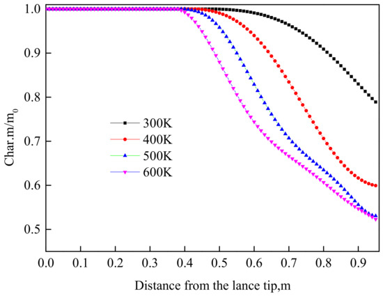 The volatile and char mass fraction were 22.08% and 77.92%, respectively, in combustibles. In other words, the volatiles only contributed a little and the char contributed a lot to the coal burnout. Therefore, to further reveal the effect of oxygen temperature on coal combustion characteristics, the change of char m/m0 was analyzed, as shown in Figure 6. The char combustion process was enhanced with increase in oxygen temperature. When oxygen temperature was 300 K, most of the char could not finish combustion at the raceway outlet. More char reacted with oxygen with the increase in oxygen temperature. Furthermore, the char reaction rate significantly increased with the increase in oxygen temperature. This was mainly due to two reasons. On the one hand, the char combustion distance was extended. On the other hand, the coal particles got more heat with the increase in oxygen temperature. Moreover, the char combustion rate slowed at the end of the coal plume with the increase in oxygen temperature. This was mainly due to the lack of oxygen at the end of the raceway region.