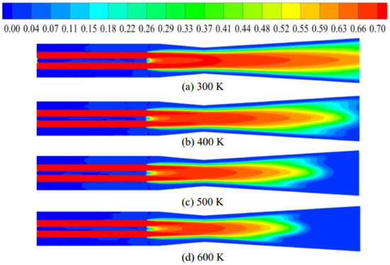 The oxygen distribution at different oxygen temperatures along Z = 0 plane was investigated, as shown in Figure 7. When the oxygen temperature was 300 K, a significant amount of oxygen was found at the raceway outlet. This further explains why most coal particles left the raceway region without full combustion. Less and less oxygen was found at the raceway outlet with the increase in oxygen temperature. When the oxygen temperature was 500 and 600 K, there was no oxygen at the raceway outlet. Oxygen therefore disappeared with the increase in oxygen temperature. This was closely related with char combustion. The coal combustion process was enhanced with the increase in oxygen temperature. Furthermore, the oxygen volume decreased with the increase in oxygen temperature. This further explains why the coal burnout increased slowly and the char combustion rate decreased at the end of the raceway region when the oxygen temperature was 500 and 600 K. When the oxygen temperature was 500 and 600 K, the oxygen concentration was the main factor affecting further coal combustion. The coal burnout would further increase by increasing oxygen concentration in the downstream of the coal plume. This is an important method for intensifying coal combustion in TGR-OBF.