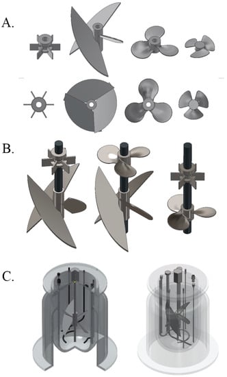 (A) Impellers used for this study (from left to right): Rushton (six-blade turbine), three-paddle helix impeller, Brunswick Bioflo/CelliGen 115 bioreactor default propeller and small propeller (abbreviated as S. Propeller). (B) The impeller combinations used (from left to right): Rushton–paddles, propellers–paddles, and Rushton–propeller. (C) The 3/4 section view 3D CAD models of: Brunswick Bioflo/CelliGen 115 bioreactor (left); and transparent view (right).