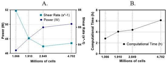 Mesh independence for: (A) power (●) and shear rate (■); and (B) computational time on Brunswick Bioflo/CelliGen 115 bioreactor.