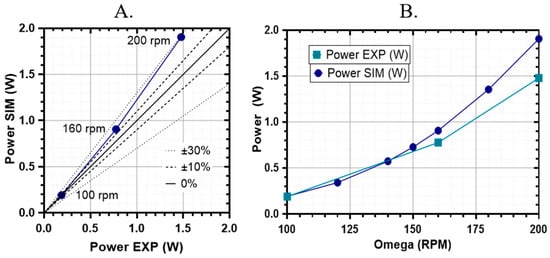 Similarly, the relationship shown in Equation (2) is used to determine power, where (power number) can be found in the literature and depends on the impeller type. According to several authors, the passage from laminar to the turbulent regime is not immediate [8,9,10]. For the case of an agitated tank without deflectors, the laminar regime can be considered for Re lower than ten and turbulent for Re above 10,000 (intermediate Re numbers are defined as in the Transition regime) [11].
