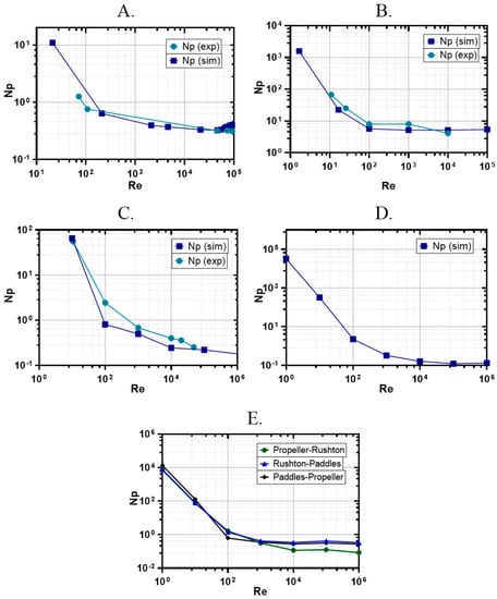 It was necessary to determine the Reynolds values and power numbers () for each flow regime to create the power curve for each impeller. This is essential to establish the behavior of each impeller from the laminar to the turbulent regime. The Reynolds number, as shown in Equations (1) and (2), depends on . The power number, on the other hand, depends on . The power curve was calculated, ranging from .