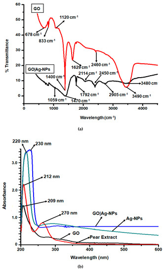 (a) FTIR and (b) UV-vis spectra of Ag-NPs, GO|Ag-NPs and pear extracts.