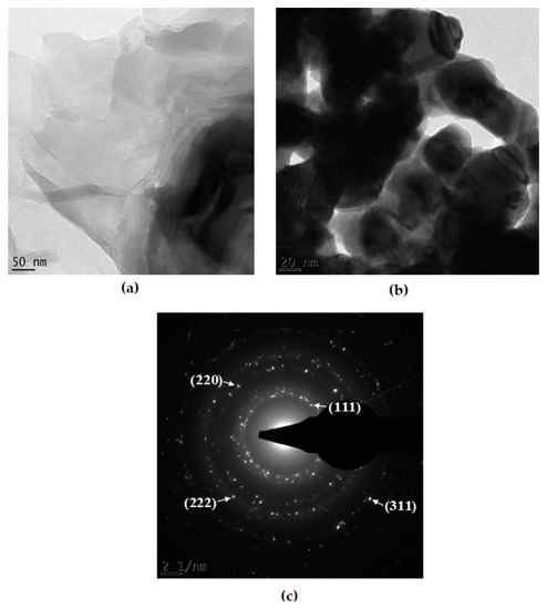 High-resolution transmission electron microscopy (HR-TEM) analyses were carried out to observe and to determine the morphology and the crystalline nature of the GO|Ag-NPs nanocomposites. Figure 2a shows the HR-TEM image of GO observed here as transparent sheets with folded edges. Figure 2b illustrates the nanocomposites in which the nanoparticles are seen attached on the GO sheets and the GO sheets are seen to congregate together to form multi-layered transparent sheets. The obtained selected area diffraction (SAED) pattern indicated in Figure 2c confirmed the crystalline nature of silver nanoparticles and showed bright circular rings corresponding to the (111), (220), (311) and (222) planes, an indication of the crystallinity of the nanoparticles [30]. A study by Surumaran et al. [36] indicated that the visible clear inner ring in the SAED microgram is an indication of the (002) crystal plane of graphene adorned with Ag-NPs, which confirms the formation of the GO|Ag-NPs nanocomposite.