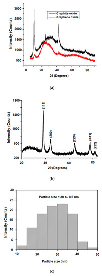 The results obtained from the X-ray diffraction (XRD) patterns (Figure 3a) are in good agreement with the SAED observations and confirm the crystalline structure of the nanoparticles with Bragg reflection peaks at 38.17°, 44.43°, 64.58° and 77.64°, corresponding to the (111), (200), (222) and (310) face-centred cubic Ag-NPs [37]. The majority of the nanoparticles in the GO|Ag-NPs nanocomposite were determined to be approximately 30 to 35 nm in diameter, as illustrated in Figure 3b, with some at various other diameters, a reflection of the multi crystalline nature of the nanoparticles. A study by Srirangam and Parameswara revealed similar SAED images after the synthesis of Ag-NPs using the leaf extract of Malachra capitata [38].