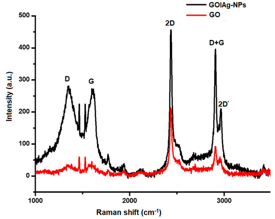 To verify the synthesis of Ag-NPs on GO layers, the structural characteristics of GO were further confirmed using Raman spectroscopy. Figure 5 provides a spectrum of GO|Ag-NPs compared to that for GO. Included herein are high intensity D and G bands near 1350 and 1580 cm−1 assigned to the breathing mode of the k-point phonons with A1g symmetry and the introduction of E2g phonons of carbon sp2 atoms, respectively. The elevated intensity of the D peak affirms the high curvature of the Ag-NPs’ surfaces attached on small flawed structures of GO caused by the attachment of epoxide and hydroxyl groups on the carbon basal plane [40,41,42]. These peaks also confirm the small domain nature of GO caused by the high curvature of Ag-NPs surfaces which also has the possibility of inducing significant strain on the lattice of GO. The high-intensity G band is caused by enhanced isolated double bonds and it seems to be upshifted by 20 cm−1 with respect to GO (1560 cm−1) resulting from the introduction of Ag by electron-phonon coupling. Furthermore, a 2D band is composed at approximately 2460 cm−1, D + G bands at 2703 cm−1 and a 2D band at 2980 cm−1. This 2D band results from the reduction of GO and Ag-NPs in the presence of pear extracts and serves to confirm the presence of GO layers in the prepared nanocomposites [40,41,42].