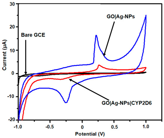 Cyclic voltammetry (CV) of bare glassy carbon electrode (GCE), GO|Ag-NPs|GCE and GO|Ag-NPs|CYT2D6|GCE in pH 7.4, 0.1 M PBS buffer solution at 50 mV s−1.