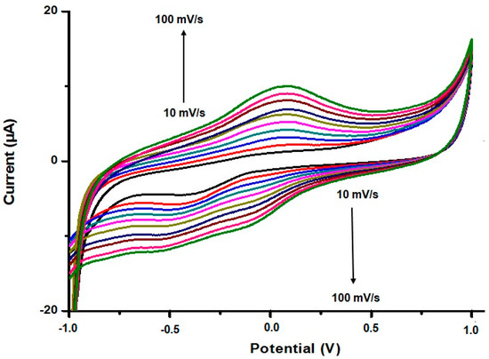 CV analysis of GO|Ag-NPs|CYP2D6||GCE at 10 mV s−1 interval scan rate intervals.