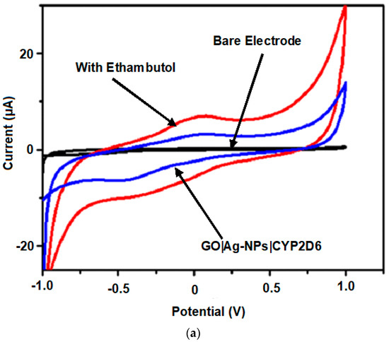 The electrochemical behaviours of EMB and PZA were studied using GO|Ag-NPs|CYP2D6||GCE nanobiosensors and investigated using CV. Figure 8a illustrates the CV of 50 µM of EMB, and Figure 8b illustrate that of 50 µM PZA initially added in 0.1 M, pH 7.4 PBS at a scan rate of 50 mV s−1 against the GO|Ag-NPs|CYP2D6||GCE nanobiosensor under nitrogen saturated conditions. The oxidation of EMB and PZA was observed at 0.14 and 0.36 V, respectively, and their anodic currents were several-fold more than those observed for bare GCE and GO|Ag-NPs|CYP2D6||GCE.