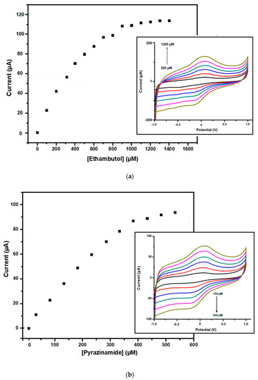 This is attributed to the stable nature of the nanocomposites as well as their increased surface area due to the presence of graphene and CYP2D6 which possesses amino acids and carboxylic active sites in its structure, further enhancing the conductivity at the surface of the already conductive nanocomposite [50]. CV was also employed in the detection of the drugs of interest and from the observed reactions, their linear ranges, detection limits (LOD) and quantifications (LOQ) were also determined. The respective responses of the GO|Ag-NPs|CYP2D6||GCE nanobiosensors towards EMB and PZA were investigated in pH 7.4, 0.1 M PBS under anaerobic conditions at 50 mV s−1. Redox waves were observed on the voltammograms when human plasma infused with different concentrations of EMB and PZA were added independently against the nanobiosensors where increased oxidation currents were observed, as shown in Figure 9a,b for each drug profile.