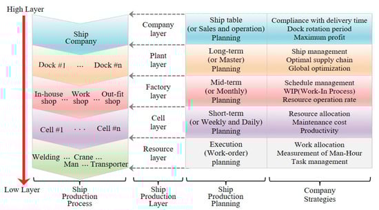 Ship production carries out production processes that consider load balancing of the workplace, loads, and facilities until the ship is ordered and delivered [5]. The production processes are produced through sequential processes such as unloading and storage of steel, steel cutting, subassembly, middle assembly, and large assembly, and then, the ship is constructed by the repeating movement and assembly of blocks until erection on the dock after outfitting, painting, and pre-erection in the shop [6]. The hull block assembly process is a particularly important task of production processes due to accounting for about 48–50% of the production process [2]. The assembly block is sequentially assembled into the subassembly, middle assembly, and large assembly according to assembly type, and the painting and outfitting such as pipes and electrical work are subsequently performed, and then, large assembly blocks are created through the pre-erection. The large assembly block, which is the final step in building blocks before being put into dock, plays a crucial role in determining the overall plan, resources, and processes of ship production. The blocks are assembled using various equipment (welding, transporters, cranes, etc.), and the ship production process operates the production plan (ship table planning, long-term planning, mid-term planning, short-term planning, and execution planning) associated with five stages (company, plant, factory, cell, and resource level), as shown in Figure 1.