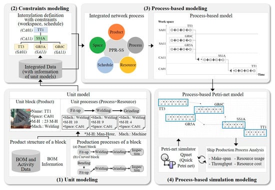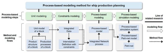 To meet these requirements, this study presents a PBM method that can virtually model the production processes of blocks. The PBM is a new method representing a series of flows by redefining mutual relations between production processes [5]. Figure 2 shows the entire PBM method’s flow. This modeling method is composed of three parts: unit modeling, process-based modeling, and process-based simulation modeling. Unit modeling designs a model including product, process, and resource information on one block produced in a large assembly factory. Constraints in the modeling designs can be conditions such as the workspace and process schedule for producing a large assembly block based on the information of the unit models. Process-based modeling presents an integrated model of describing the factory by linking unit models as one process through the integrated network process, which links unit models according to the PPR-SS conditions of the factory. Afterwards, to verify the feasibility of implementing a process-based model, process-based simulation modeling designs a simulation model using a Petri-net simulator and analyzes the productivities of the ship block assembly planning.