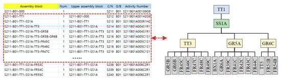 The block assembly sequence is identified by the block number and former relationship from the middle-term planning information, as shown on the left side of Figure 3. Block information is represented by the work breakdown structure (WBS), which represents the shipbuilding process, as shown on the right side of Figure 3 [3,12,32]. On the left side of Figure 3, the hierarchy structure information includes various information for block production and, in this figure, represents six information. Assembly block represents the name of the block and the hierarchy structure. Number (Num.) represents the number of blocks. The upper assembly block represents the upper block that is assembled after the production of the assembly block. The construction number (C/N) is the number for managing the block production, and the goal block (G/B) represents the final assembly block. Finally, the activity number represents the management code for managing the assembly blocks as data. The WBS is, as a planning element, widely used in shipbuilding industries and has a hierarchical structure of project components that are defined for the entire ship production process. The WBS is based on middle-term planning information, and this study defined each block as a unit block [12]. The unit block is used as basic information to determine the order in which the blocks are produced and the process to produce one large assembly block. On the right side of Figure 3, the names of the blocks vary depending on the shape of the block and the compartment of the ship. First, TT1 and TT3 are expressed by the letter T (Transverse bulkhead), which means an area or structure, and in two words, T1 and T2 (Top 1 or 2), indicating the length, direction, or height of the hull. SS1A also represents the area (S, Side shell) and location (S, side 1A). GR5A and GR6C represent the letter G (pre-erection block), R (Hatch cover) and location (5A and 6C). Sub blocks are also defined, like GR5B~GR6B (G: Pre-erection block, R: Hatch cover, 5B–6C: Location), FR45C~FR54B (F: Fore end construction, R: Hatch cover, 45C–54B: Location), BX1A (B: Bottom, X: Additional block, 1A: Location), and TT5 (T: Transverse bulkhead, T: Top block, 1: Location). These block names are defined and managed differently depending on different shipyards and the type of blocks.