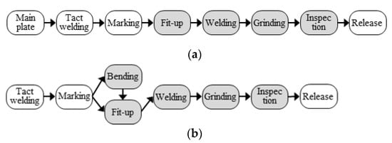 Generally, blocks have different production processes depending on their type [5,16]. Figure 4 represents the process of assembling panel blocks and curved blocks in a large assembly factory, while Table 2 introduces the process details. The main difference between the panel and curved blocks processes is if it includes or not plate forming. Plate forming refers to bending works for processing members at certain angles using a welding machine. In this study, the panel block process and curved block process, according to the type of blocks, are implemented using general-welding and digital-welding machines, respectively. Depending on the characteristics and types of blocks, Table 2 represents process tasks according to the production processes, as shown in Figure 4. The blocks are produced by performing these tasks sequentially. Current block production processes vary by block type. They are not standardized, because only processes that can be identified at cost are stored and utilized as information. Therefore, this study used only the shaded processes in Figure 4 to design the unit model. The process was named the unit process.