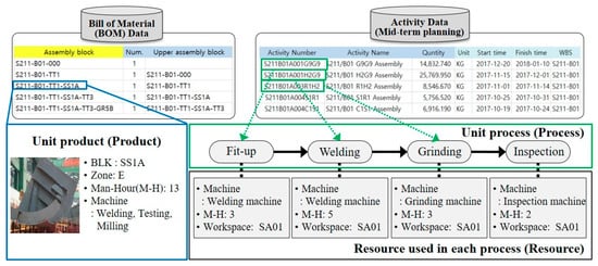 To identify the block production situation accurately, large assembly blocks require information on the resources and processes used in block production. Information used in actual block production is BOM data, activity data, and activity relationship data, as shown in Figure 6. To quickly check interrelations between the blocks, this study constructs integrated data based on the assembly transmission line and activity number in each dataset, such as in Figure 6. The integrated data saves information from the unit blocks and includes major information (i.e., quantity, mutual process relationships, schedules, and space). Unit model data within integrated data represents the data structure, as shown in Figure 6. Each table row represents a unit model and consists of a block name, upper-level block, quantity, from-to relationship, schedule, duration, spatial numbers, activities, and attributes. The upper-level block, form-to relationship, schedule, and spatial numbers are used as conditions for creating a process-based model. The schedule is expressed in the form of dates, from start time to finish time. The difference between these two times is used to calculate the resource capacity, the total amount of resources used in the processes for block production. The from-to relationship represents the activity that moves after the block process is completed. The attribute is an index value for the resource types used in the unit process model. If the attribute value is 1, then the general-welding machine is used, and if the attribute value is 2, then the digital-welding machine is used.