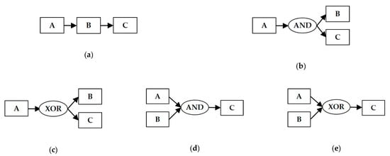 Workflow modeling patterns: (a) sequential operation, (b) parallel operation (AND-split), (c) choice operation (OR-split), (d) synchronized operation (AND-join), and (e) join/merge operation (OR-join).