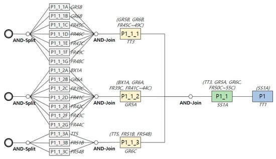 From a workflow perspective, an arc connected to a higher-level part in the BOM means the production process and assembly of a lower-level part. The TT1 block in Figure 8 is the large block, produced by assembling ten lower-level blocks. Therefore, the lower-level blocks’ production process must be completed before the production process for the next large block (TT1) can proceed. This can be expressed through the AND-split and the AND-join workflow relationship. Figure 8 shows the BOM conversion for the TT1 block into the workflow, and P1_1_n represents the manufacturing process for the subblocks.