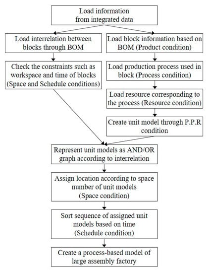 Figure 9 shows an integrated network process flowchart. First, the block products, processes, and resource information are loaded from integrated data. Thus, a unit model that includes products, processes, and resource information. Connecting unit models requires interrelations from the high-level blocks to the low-level blocks. The next stage consists of two steps, including defining the interrelations between the blocks through the BOM and creating unit models through PPR conditions. Furthermore, unit models are connected according to BOM-based interrelations and expressed in the AND/OR graph. However, that alone by itself is not enough to describe a large assembly factory. Therefore, production processes for the blocks should be indicated by adding SS conditions (space and schedule) to the graph. For space, unit models are allocated according to the spatial numbers in Figure 6. Afterwards, in the schedule, allocated unit models are arranged based on their start and finish times. The integrated network process is the initial step in order to create a process-based model that represents a large assembly factory. These steps support the integration of unit models based on PPR-SS and play a major role in creating an integrated model that represents the production processes.