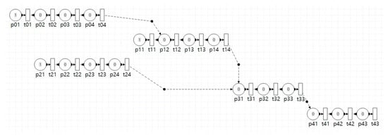 Following the transformation steps specified in Section 5.4.1, this section transforms the process-based model for large assembly factories into a process-based Petri-net model, as shown in Figure 12. The structure of the Petri-net can model situations describing logical flows, and the marking of the Petri-net shows the active situation or event. The process-based Petri-net model contains 18 places (p01–04, p11–14, p21–24, p31–33, and p41–43) that replace all common functional elements of unit models 0–4, which are indexed in Table 4. This study set the initial token number for places 01, 05, and 09 (initial elements of UM0-2) to 1 for starting the state transition. The tokens can move to the next place if unit models’ tokens are located on an interrelated place, and they should wait until the number of tokens are met.