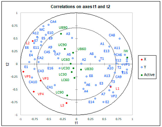 Partial least squares regression (PLSR) analysis, chemical data and the correlation of Muscat Ottonel wines between ageing method and period (t1, chemical components of initial wine; t2, chemical components released from wood). IW, UC30, UC60, UC90, LC30, LC60, LC90, UB30, UB60 and UB90 are the abbreviations for 10 wines of Muscat Ottonel (IW—initial wine, UC—untoasted chips, LC—light toasted chips, UB—untoasted barrel; 30, 60 and 90—number of days of ageing). A1 (isobutanol); A2 (isoamyl alcohol); A3 (1-hexanol); A4 (4-methyl-1-pentanol); A5 (E-3-hexenol); A6 (z-3-hexenol); A7 (2-nonanol); A8 (1 heptanol); A9 (2,3-butanediol); A10 (3-methylthio-1-propanol); T1(linalool); T2 (terpineol); A11(2-phenylethanol); T3 (trans-geraniol); A12 (glycerol); A13 (benzyl alcohol); MC (acetion); E1 (isoamyl acetate); E2 (hexyl-acetate); E3 (ethyl hexanoate); E4 (ethyl lactate); E5(ethyl octanoate); E6(ethyl 3-hydroxybutanoate); E7(ethyl decanoate); E8 (monoethyl-succinate); E9(phenethyl-acetate); E10(diethyl malate); E11(diethyl succinate); E12(trimethylene acetate); E13 (ethyl glycinate); E14(citronellol acetate); E15(ethyl-4-hydroxy-butanoate); CA1(butanoic acid); CA2 (hexanoic acid); CA3 (isovaleric acid); CA4 (lactic acid); CA5 (octanoic acid); CA6 (decanoic acid); CA7 (E-2-hexenoic acid); CA8 (hexadecanoic acid); CA9 (pydolic acid); CA 10 (2-oxoapidic acid); E16 (diethyl 2-hydroxy-3-methylsuccinate); VP1 (2,3-dihydrobenzofurane); VP2 (methyl-hydroxycinnamate); L1 (3,4-dimethyl-2(5H)-furanone); L2 (butyrolactone); L3 (pantolactone); VP3 (p-vynil guaiacol); VP4 (acetovanillone); VP5 (vanillin).