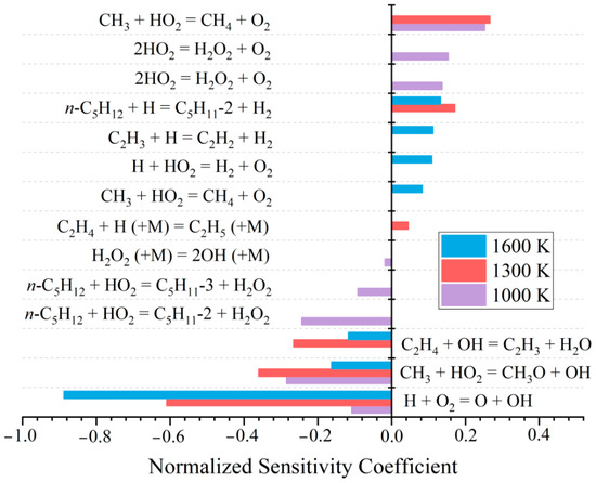 The normalized sensitivity coefficients of ignition delay time calculated with NUIG at an equivalent ratio of 1.0 and temperatures of 1000 K, 1300 K and 1600 K, respectively.